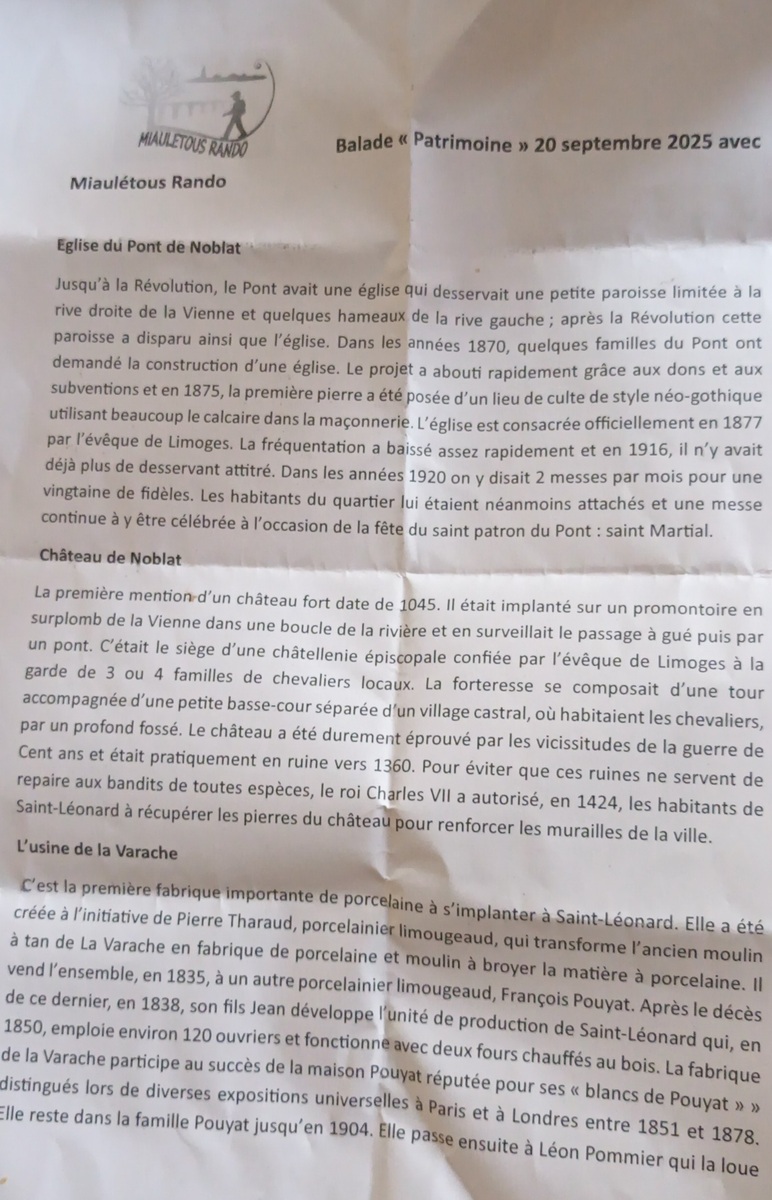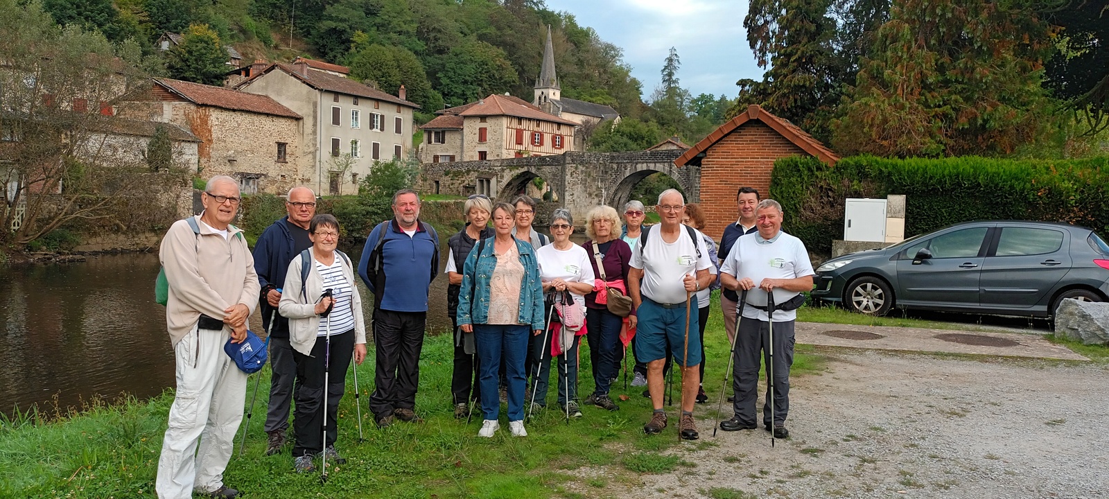 Ce samedi matin une quinzaine de nos adhérents s'était retrouvée au parcours de santé de St Léo pour la journée du Patrimoine. Après un petit café, préparé par notre Président, nous sommes partis par les venelles et le vieux pont jusqu'à l'église du Pont de Noblat que Daniel nous a ouverte pour l'occasion. Jacques Peyrichout et Bernard Bernaben se sont associés pour nous expliquer l'historique des lieux importants de St Léonard tout au long de la randonnée (l'église, le château, le chêne de Clovis, l'usine de la Varache et le viaduc). Merci à Jacques et Bernard pour nous avoir fait partager leur passion du passé de la région. Merci à Chantal L et Daniel pour l'organisation de cette sortie.